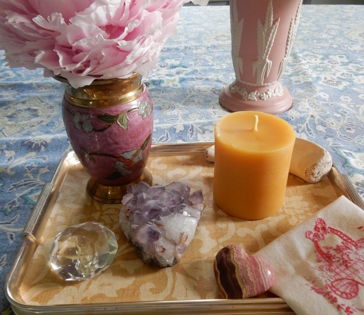 Some suggestions for your Altar Objects might be Candles, Feathers, Crystals, flowers and herbs, Favourite stones and shells, spiritual figures, Special textiles to place your pieces on, and of course,a journal to record your thoughts!
