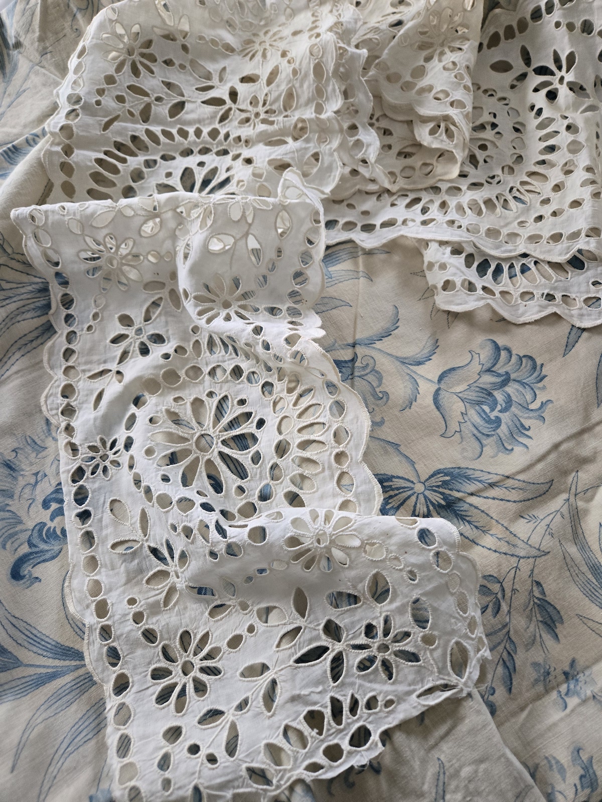 Broderie This is a lovely curtain reminiscent of the Victorian petticoats of past times, embellished with intricate whitework and Broderie Anglaise.An all cotton privacy curtain, with the lightness of bottom scallops and 30″ of sheer whitework.Curtain measures 38″W x 56″L including a 2″ rod pocket. The cotton is lightweight.